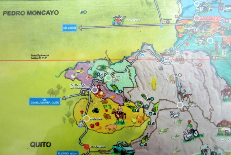 Überquere ganz unspektakulär den Äquator zwischen Cayambe und Oton und kann auch am Navi erkennen, dass jetzt die Sonne um ca. 6:21 morgens auf- und abends untergeht.