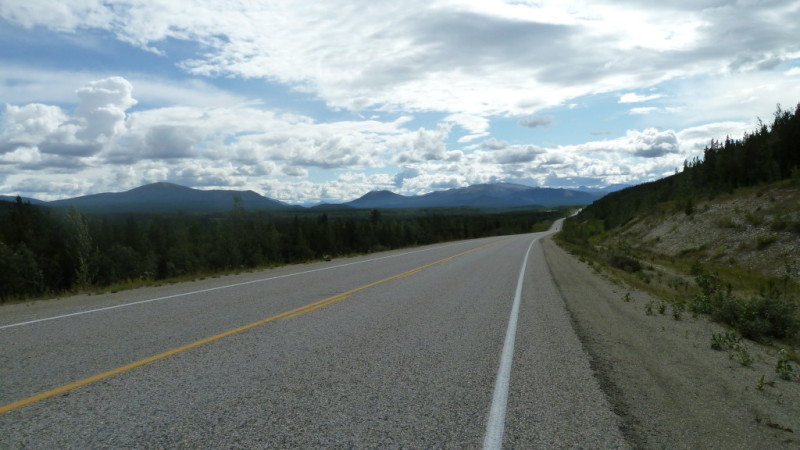 Im Anschluss führt die Straße einen Berg hoch und eröffnet den Blick auf nicht enden wollende grüne Tannenwälder und die Yukon Gebirgszüge. Der Highway verläuft jetzt oberhalb der Baumspitzen, die im Vergleich zu den Bergen wie Streichhölzer erscheinen. Um mich herum 180 Grad wilde Natur und 180 Grad Himmel. Ich fahre verträumt im Sonnenschein, sprachlos von dem Naturschauspiel, dass ich um mich herum verfolgen kann. Regengüsse, die zwischen weit entfernten Bergen vorbei ziehen und sonnenüberflutete Gebirge auf der anderen Seite. Ich fahre vom Sonnenschein in den nächsten Regen und zurück.