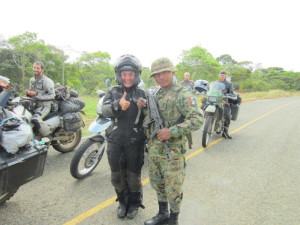Gestern noch konnte ich die Polizeikontrolle vor Chepo einfach passieren. Heute sind wir mit einer großen Gruppe unterwegs und sie halten uns natürlich an. Hier sind alle ganz nett, wenn man selbst nett ist. Ein freundliches „Buenas dias“ und ein paar Worte in Spanisch reichen fast immer aus, um alle positiv zu stimmen. Die zweite Frau hinter mir, weiß das wohl noch nicht und so spricht die Polizistin lieber mit mir und fragt, ob meine Mitfahrerin schlecht gelaunt ist. Es geht mir nicht nur darum Motorrad zu fahren, sondern auch die Menschen kennen zu lernen. Erst gestern in Chepo habe ich zwei (vollbewaffnete) Polizisten angesprochen und nach dem Hotel gefragt. Sie waren sehr hilfsbereit und interessiert, haben mit ihrer Fotokamera Bilder von sich auf Matts Motorrad und mir daneben gemacht als er es ihnen anbot. Zum Hotel vorgefahren sind sie allerdings nicht mehr.