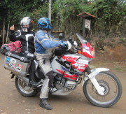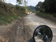 Gegen Mittag wird der Regen weniger und David und ich fahren die zunächst geteerte Straße. Die Straße hat bereits nach einem Kilometer wieder richtig tiefe Löcher und zum ersten noch fünf Kilometer entfernten Park hin, gebe ich nach der Hälfte auf, weil es schlammig und auch noch steil bergauf geht. Bin ehrlich froh, dass auch David diese Strecke nicht mehr weiter fahren würde. Heil zurück auf der ungeteerten, aber gut zu fahrenden „Hauptstraße“, geht es weiter. Ich traue mich auch hier irgendwann nicht mehr weiter, denn eine wirklich steile, sehr steinige, unebene und matschige Stelle bergab habe ich gerade noch unversehrt hinter mir gelassen und nun will mein Kopf nicht mehr mitspielen. David kennt das und nimmt mich das letzte eher unproblematische Stück zum fantastischen Blick auf den Fluss auf seinem Motorrad mit. Das ist wirklich entspannend und gibt erneute mentale Kraft für den spielerisch gemeisterten Rückweg auf dem eigenen Bike.