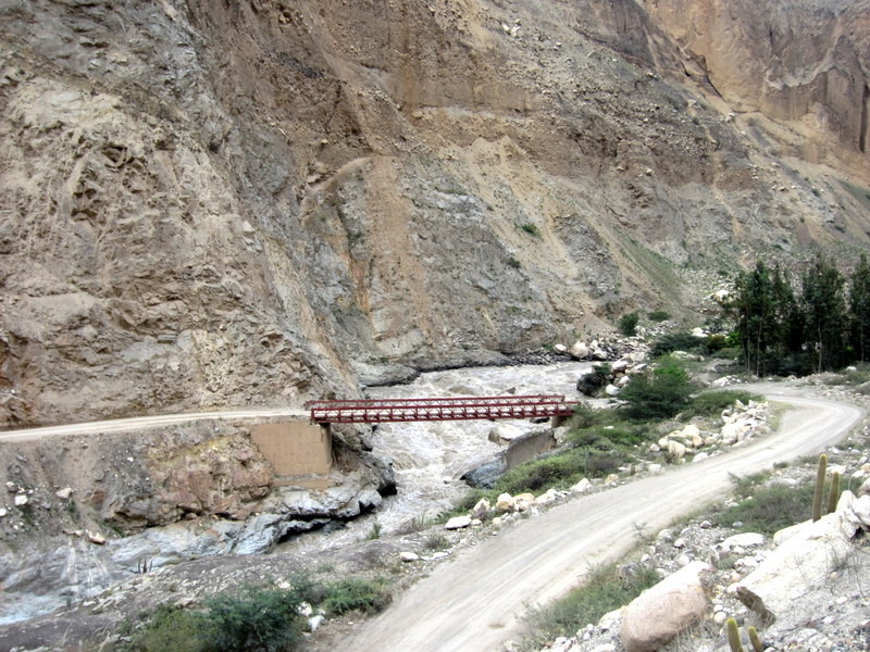 Dann nehme ich die Straße Richtung Canon del Pato und erreiche kurz vor Ende der geteerten Straße eine Polizeistation. Die Straße ist abgesperrt und ich erkundige mich bei den beiden Polizisten, ob ich hier weiter lang fahren kann und wie lange es dauert um nach Caraz zu kommen. Nur noch 100 Kilometer steiniger Weg für die kommenden drei Stunden. Zwei Stunden am Fluß entlang und dann rechts halten, erfahre ich, keine Restaurants und vor mir sind hier schon Italiener und andere Deutsche mit dem Motorrad durchgefahren. Geht doch!