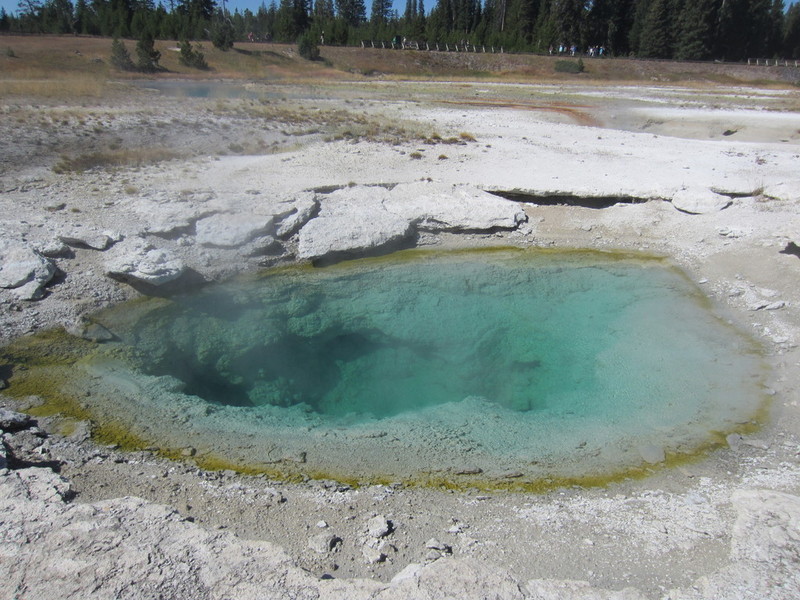 Auf dem Weg zum westlichen Eingang des Yellowstone Parks wird es langsam wieder grüner. Es gibt sogar hier und da einen kleinen See und bewässerte Anwesen mit Blumen vor der Haustür. Der Vergleich ist jeden Glückes Tod, dachte ich als ich in den Park von der Westseite her hinein fahre. Kilometerlang fahre ich an kleinen Tannen vorbei. Vielleicht ist man hier ja froh, überhaupt etwas Grünes zu sehen, denke ich mir. Das soll sich schon am nächsten Morgen bei der kürzeren 180 Kilometer langen Rundfahrt durch den Park ändern. Ich treffe auf unwirklich scheinende Landschaften: Flüsse, an deren Seiten das Wasser kocht, Büffel neben dampfenden Erdlöchern, ganzen Büffelherden auf heißem Boden, dem farbenprächtigen Yellowstone Canyon und speienden Geisieren. Beeindruckend ist auch die an den Autos und meinem Motorrad vorbei ziehende Büffelherde. Eine Motorradfahrerin, in schwarzer Bekleidung und offenen Helm, scheinen die Büffel noch nicht so oft gesehen zu haben. Sie schauen mir geradewegs in die Augen. Mir stock der Atem, verhalte mich lieber ruhig, lasse mein knatterndes Motorrad ausgeschaltet und suche Schutz hinter ihm oder den stehenden Autos. Instinktiv, das richtige Verhalten wie ich später im Informationmaterial lese. Die Warnung vor den wilden Bären, macht zwar Hoffung auf welche, diese und die anderen Tiere halten sich aber von der viel befahrenen, rund um den Park führenden Straße lieber fern. Was ich gut verstehen kann. Ich wäre auch lieber ab Mitte September hergefahren, wenn der Touristentrubel vorbei ist. Nur leider kann dann im über 2000 Meter hoch gelegenen Yellowstone Park schon Schnee fallen und mit dem Motorrad ist das nicht mehr lustig, wie die Fahrt durch den Denali Park in Alaska gezeigt hat. Immerhin sehe ich noch brütende Weißkopfadler und ein lebendes Karibou auf der Straße. Die vielen toten Rehe am Rande der Straße Richtung Salt Lake City am nächsten Tag lassen auf regelmäßige Unfälle mit Tieren hier schließen.