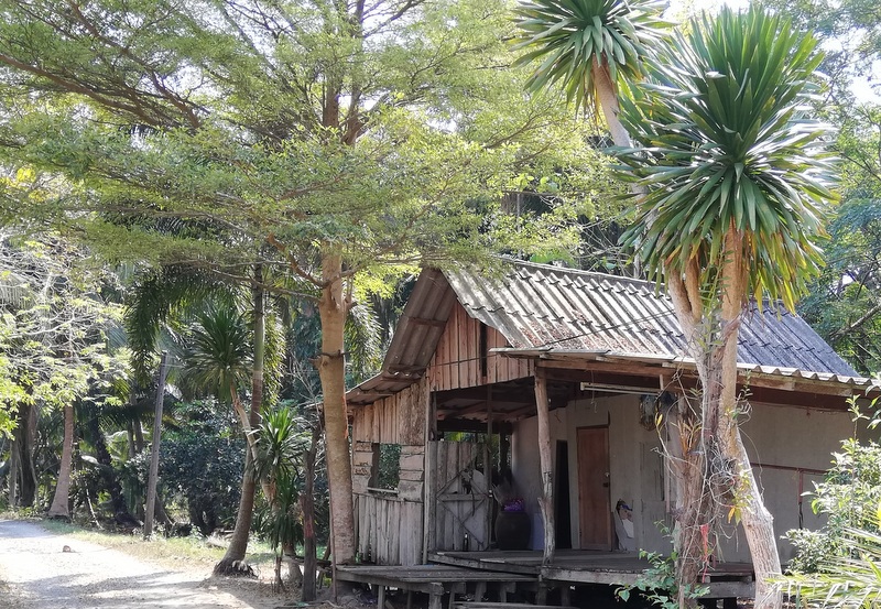 Ich drehe um und biege direkt am buddhistischen Tempel in den kleinen Weg ein, an dem lediglich ein Schild auf thailändisch wahrscheinlich auf den Mangrovenpfad hinweist.